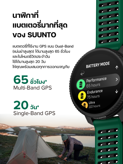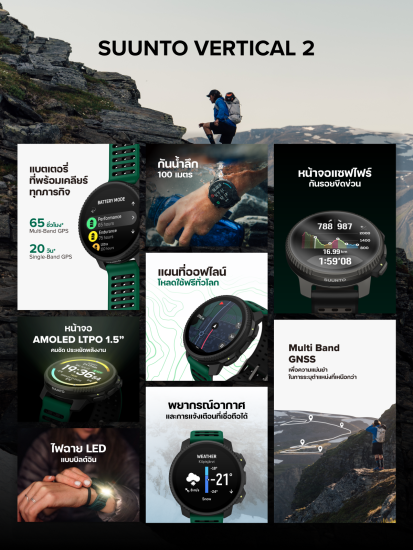 Suunto Vertical 2 คู่หูที่สมบูรณ์แบบสำหรับนักกีฬาสายเอาท์ดอร์และนักผจญภัย ถูกออกแบบมาเพื่อความทนทาน การนำทาง และประสิทธิภาพในทุกสภาพแวดล้อมที่ท้าทาย ไม่ว่าคุณจะพิชิตยอดเขาสูง สำรวจเส้นทางที่ไร้ร่องรอย หรือเก็บระยะทางยาว ๆ ในการฝึกซ้อม Vertical 2 พร้อมจะไปให้สุดทางกับคุณเสมอ หน้าจอที่สว่างกว่า ฮาร์ดแวร์ที่แข็งแกร่งขึ้น และฟีเจอร์ใหม่ ๆ ที่ช่วยนำทางทุกเส้นทาง แบตเตอรี่ที่ใช้งานได้ยาวนานโดยสามารถใช้งาน GPS แบบ Dual-band ได้สูงสุด 65 ชั่วโมง และใช้งานในโหมดสมาร์ทวอทช์ได้ยาวนานถึง 20 วัน